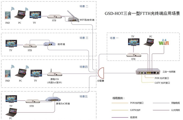 GSD-HOT 三合一型 FTTH 光終端是一款內(nèi)置了 CATV 及 ONU 光模塊和同軸電纜調(diào)制解調(diào)模塊的無源光網(wǎng)絡(luò)終端。該產(chǎn)品基于成熟穩(wěn)定的 EPON 技術(shù),并融合了千兆以太網(wǎng)交換技術(shù)和同軸電纜網(wǎng) EoC 技術(shù),不僅系統(tǒng) 可靠性高,而且組網(wǎng)部署方便,為 FTTH 網(wǎng)絡(luò)光纖入戶后駁接室內(nèi)原有的同軸電纜網(wǎng)絡(luò)提供了一個便捷的 解決方案,使原有的 EOC 網(wǎng)絡(luò)設(shè)備(包括 EOC 終端和內(nèi)置 EOC 模塊的雙向機頂盒)在不做任何改動的 情況下,就能方便地接入新建的 FTTH 網(wǎng)絡(luò),并能同時支持寬帶上網(wǎng)和 VOD 點播等多個業(yè)務(wù)。